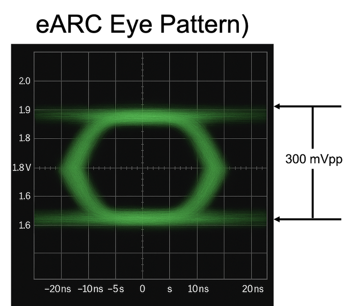The maximum allowable skew between the two lines of the differential pair is less than 50 ps. Excessive skew translates directly into eye closure at the receiver and loss of deterministic timing, particularly because eARC’s high-speed clock recovery uses the data stream itself rather than an embedded separate clock. The data rate, while only a fraction of FRL’s multi-gigabit speeds, is still high enough to be sensitive to phase mismatch.